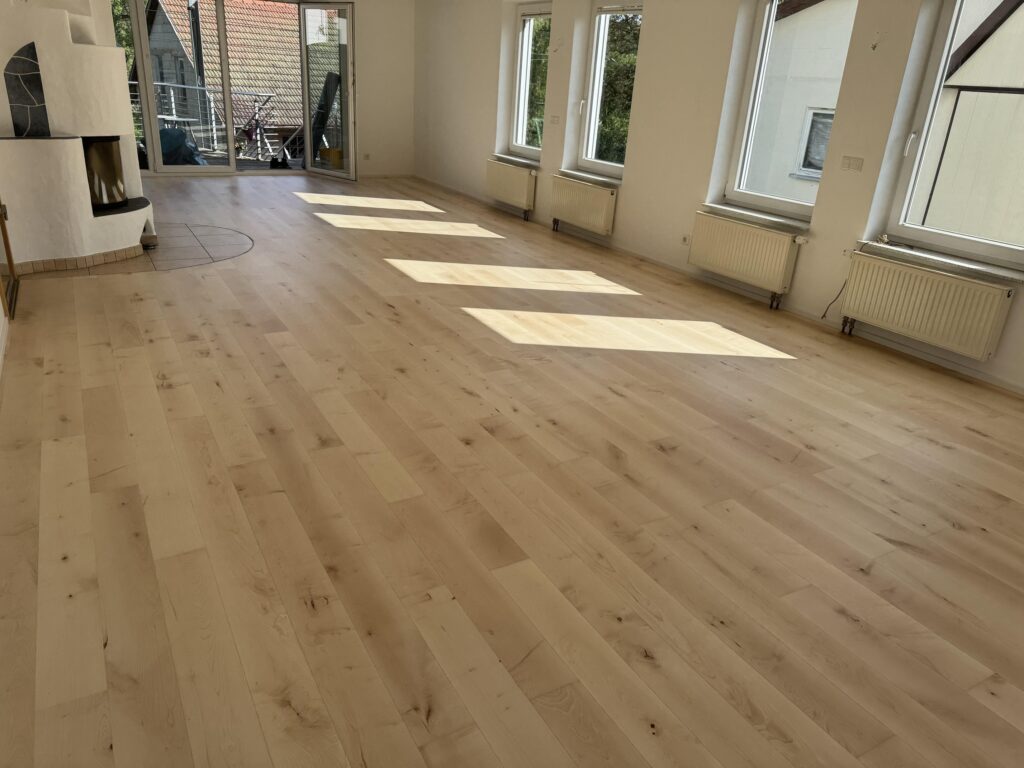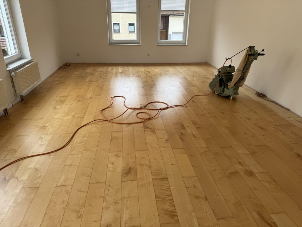 Um die Werterhaltung Ihres Bodens sicher zu stellen, sollte man nach 15 – 30 Jahren das Parkett abschleifen und neu oberflächenveredeln. Sie können sich zwischen einer natürlichen, geölten oder einer versiegelten  Oberfläche entscheiden. Je nach Art der Oberflächenbehandlung kann das Parkett nach 2 – 7 Tagen wieder voll beansprucht werden. Nach der Sanierung liegt Ihnen Ihr Parkett in strahlend neuem Glanz zu Füßen.